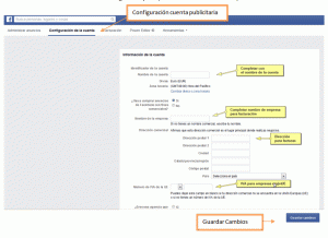 El segundo paso es abrir una cuenta de publicidad en Facebook. Para ello accede al admistrador de anuncios https://www.facebook.com/ads/manage y completa la información sobre configuración de la cuenta, especificando los datos de facturación (el nombre y dirección de tu empresa o a nombre de quién emitirá Facebook las facturas).