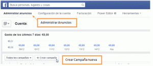 Una vez completados estos dos pasos podrás empezar a publicar anuncios: En el adminsitrador de anuncios ve a la pestaña «administrar anuncios» y pulsa en crear una campaña.
