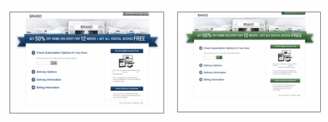 En el siguiente ejemplo la misma landing page tuvo una conversión mejor en un 11% utilizando colores azules en lugar de verdes. La razón parece ser que la marca se asociaba con el color azul y esto daba fuerza a la proposición de valor y al mensaje.