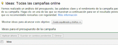 Hasta ahora en la sección de oportunidades de tu cuenta de AdWords podías ver sugerencias de nuevas palabras claves que te proporcionarían tráfico adicional y el volumen de búsquedas de estas. Desde ahora podrás encontrar además las nuevas ideas sobre presupuestos y pujas que pueden ser útiles si no sabes muy bien en qué rangos de CPCs moverte o si quieres asegurarte una visibilidad total en tus campañas.