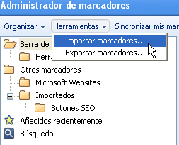 2. Abre el Administrador de Marcadores desde el menú herramientas de Chrome, pincha en importar marcadores y elige el archivo con la extensión que has guardado.