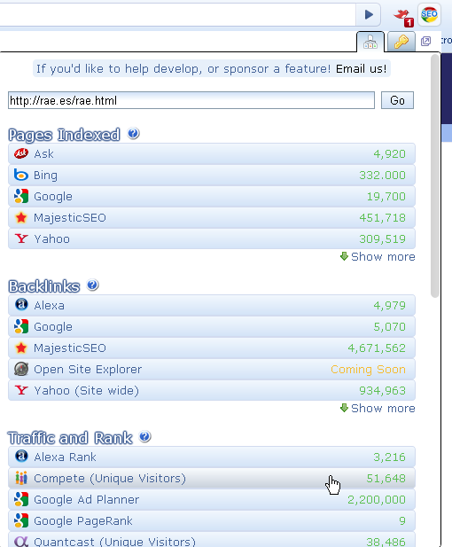 Algunas de las funciones de la extensión SEO son información sobre keywords y enlaces, caché de la página, ranking en Alexa y Page Rank de Google, detecta Robots.txt y Sitemaps, información de dominio como DNS, IP, ubicación del servidor y whois, etc.